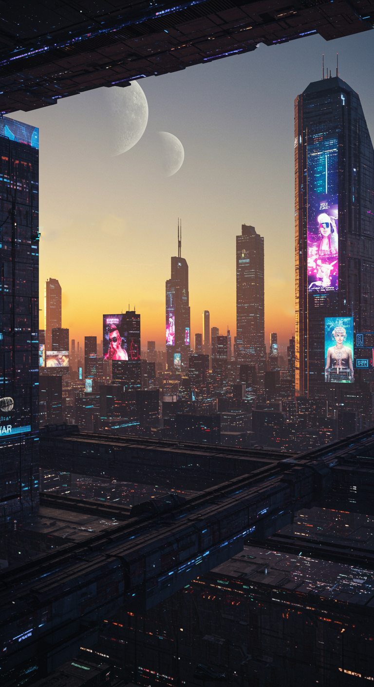 Tonight, I witnessed New Liberty in its full brilliance. As the moons climbed higher, the city came alive. Entire skyscrapers became canvases for cascading light displays, some showing scenes of distant colonies and others weaving intricate patterns that rippled across the skyline. The entire metropolis seemed to breathe, its rhythm pulsing with the life within it.