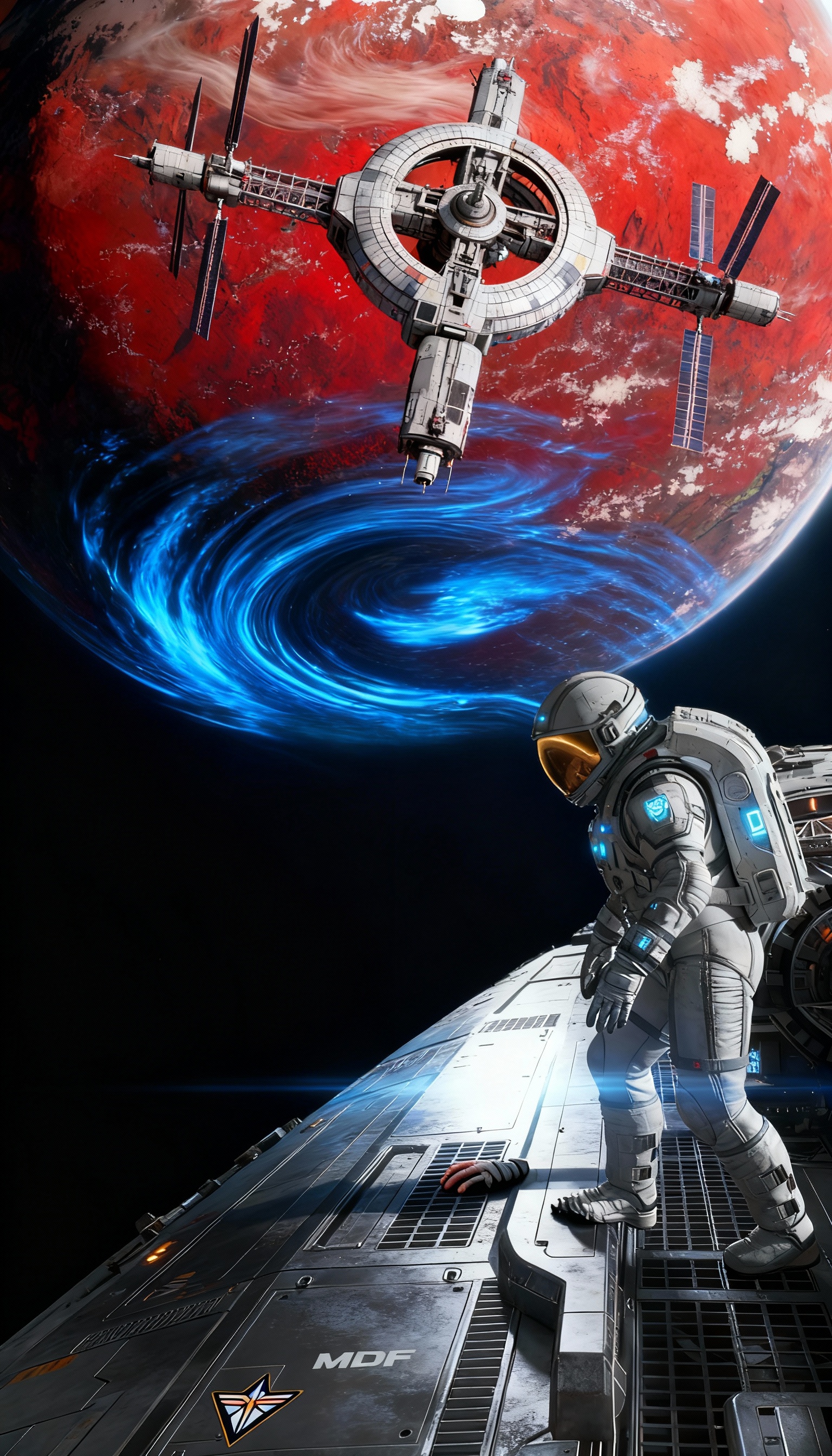 I’m Senior Structural Tech Rian Velez, Terran born, forty-seven standard years. Outer Colonial Defense Net, MDF ship Caliban. We’re parked high over Port Helena — dust, rock, and wind pretending to be a colony. The locals don’t want us here, but they want what’s coming even less.
