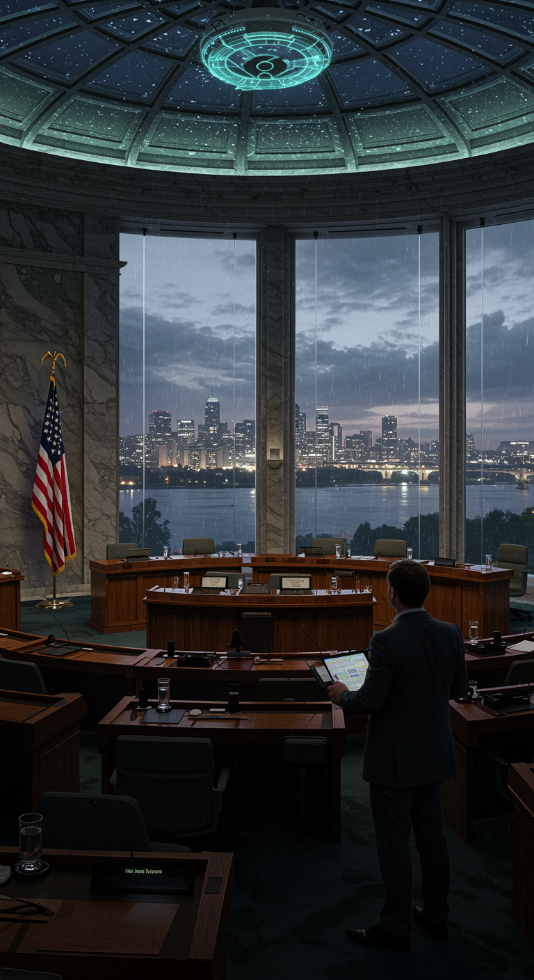 I arrived early for the Pittman hearing because the chair believes empty rooms invite surprises. The chamber lights were low, the dais a half circle shaped like a smile that never reached the eyes. Through the tall windows, the city blinked awake, transport ribbons lighting up, the river smoothing itself into a sleeve. If you looked straight up at the rotunda, you could see a false Vega slide past, calm as a saint. I did not look up.