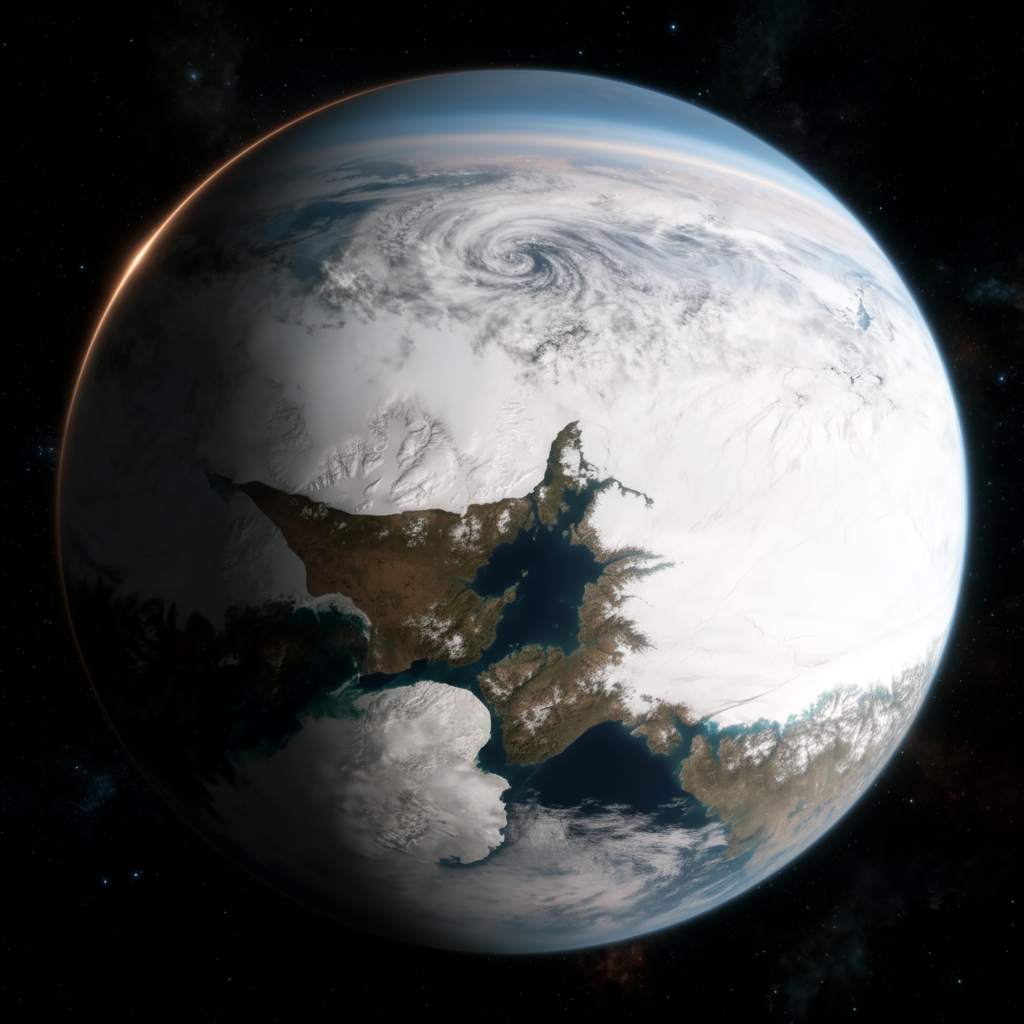 The planet is covered by deep global oceans with only scattered island chains. Most human habitation occurs on floating arcologies that move with the currents, powered by solar and tidal energy. Beneath the surface, automated aquaculture facilities and undersea research domes sustain both the economy and ecology.