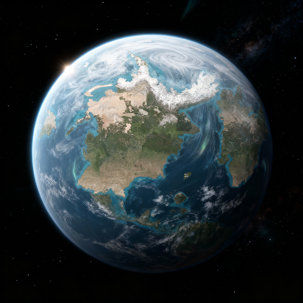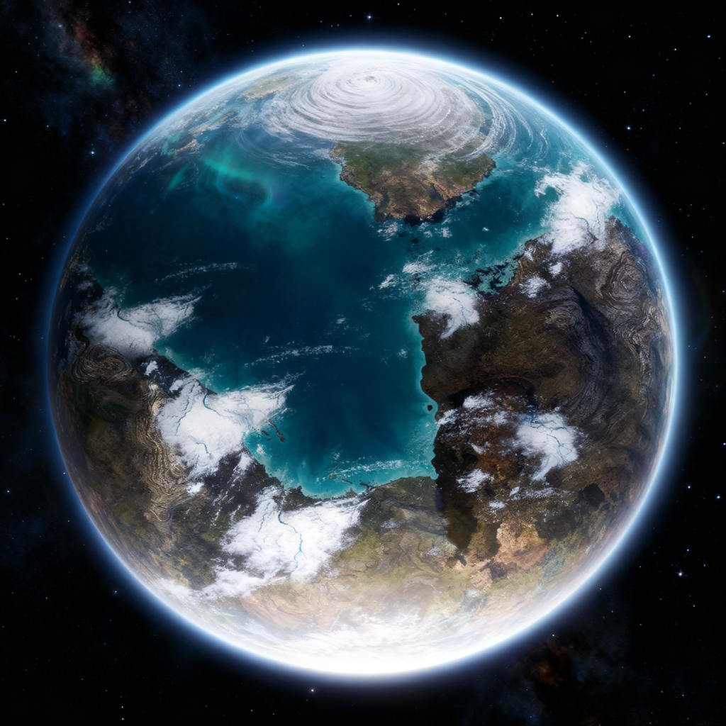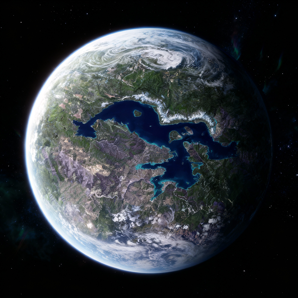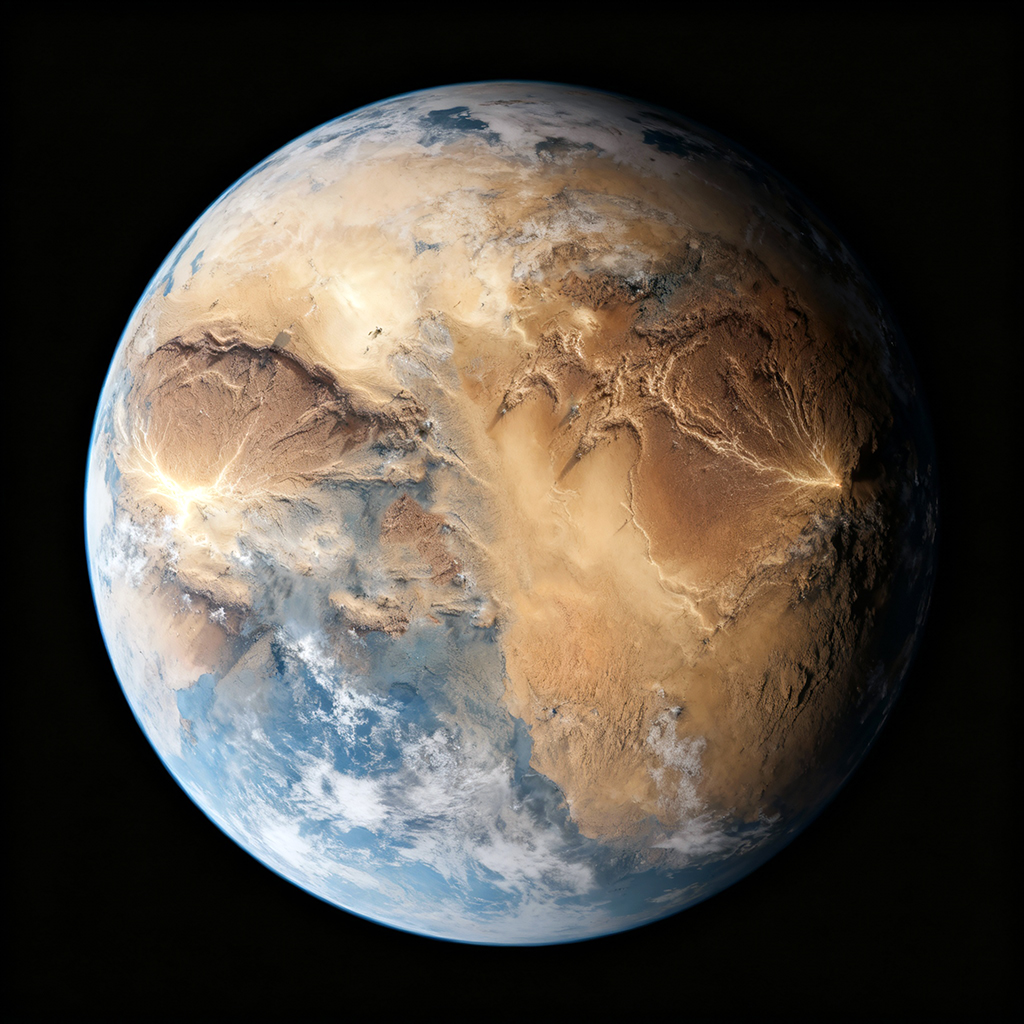 Pace’s geography is dominated by a single massive supercontinent that spans nearly three-quarters of its surface, surrounded by vast oceans that temper its dry climate. The landmass is characterized by expansive deserts, rugged highlands, and deep tectonic basins shaped by ancient waterways. The planet’s surface alternates between pale, arid plains and darker upland regions, with coastlines cut by bays and gulfs where life clusters along the water’s edge.