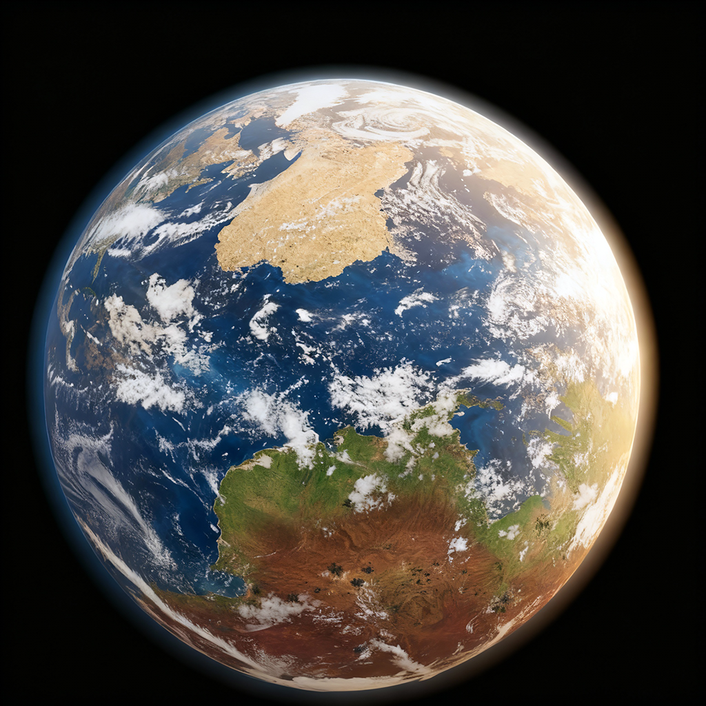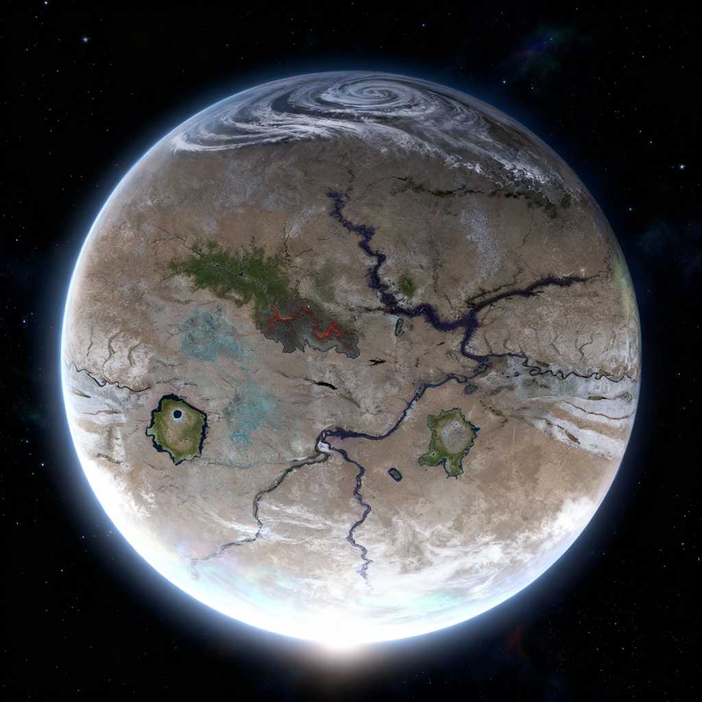 Keo Terra’s geography is defined by contrast and abundance. With a radius of 8,979 km and a gravity of 1.13 G, it is slightly heavier than Earth but equally lush. Seventy percent of the planet’s surface is covered in oceans, while its two supercontinents — lush southern Arvalen and arid northern Kalthis — are connected by rich equatorial seas. A network of archipelagos forms vital trade and research hubs. Its mean temperature of 281K (8°C) supports a wide range of climates, from rainforests and river valleys to wind-carved deserts and alpine ranges.