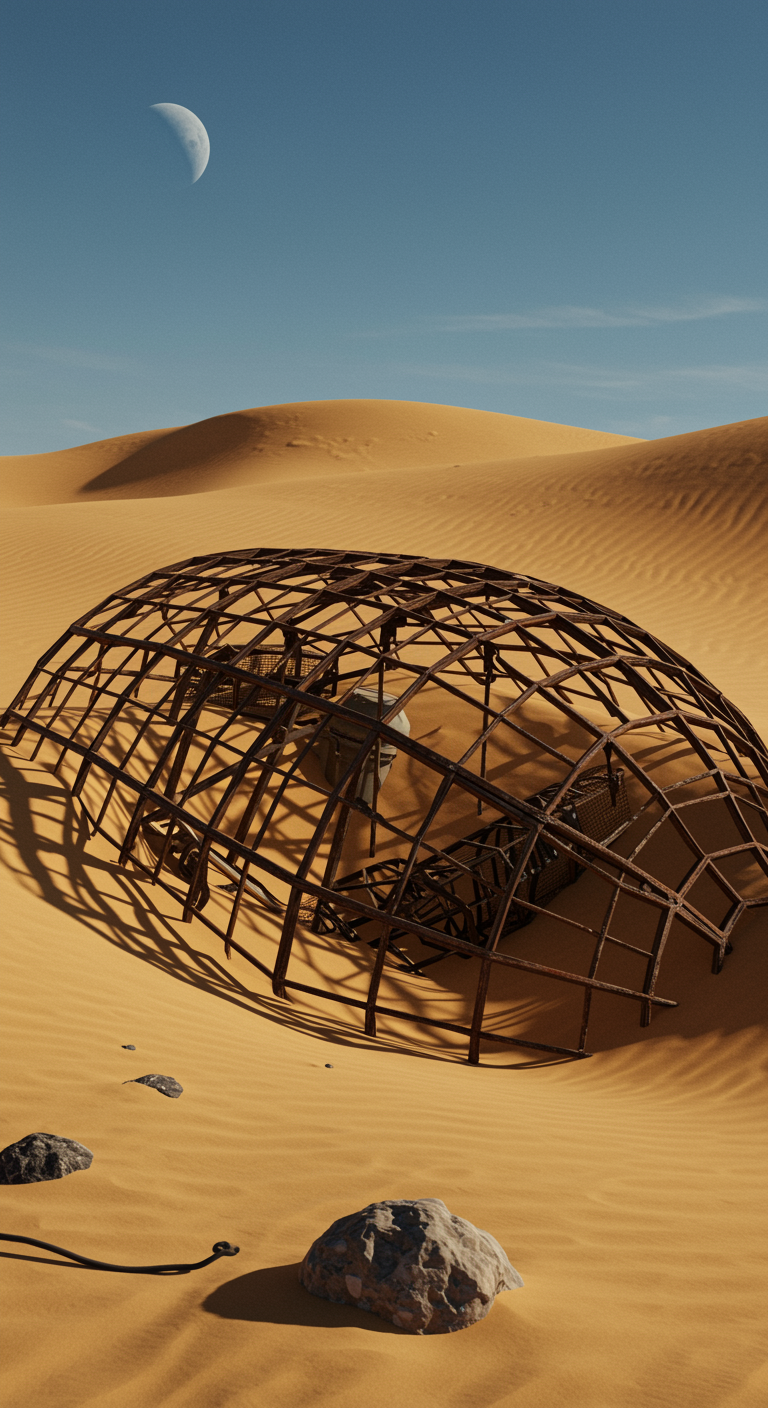 Our final day brought an unexpected discovery. West of our base, we found the remains of an old human structure buried beneath the dunes. The metal frame was corroded and covered in sand, but its design was unmistakably human. Someone had been here before us. No records mention such a mission.