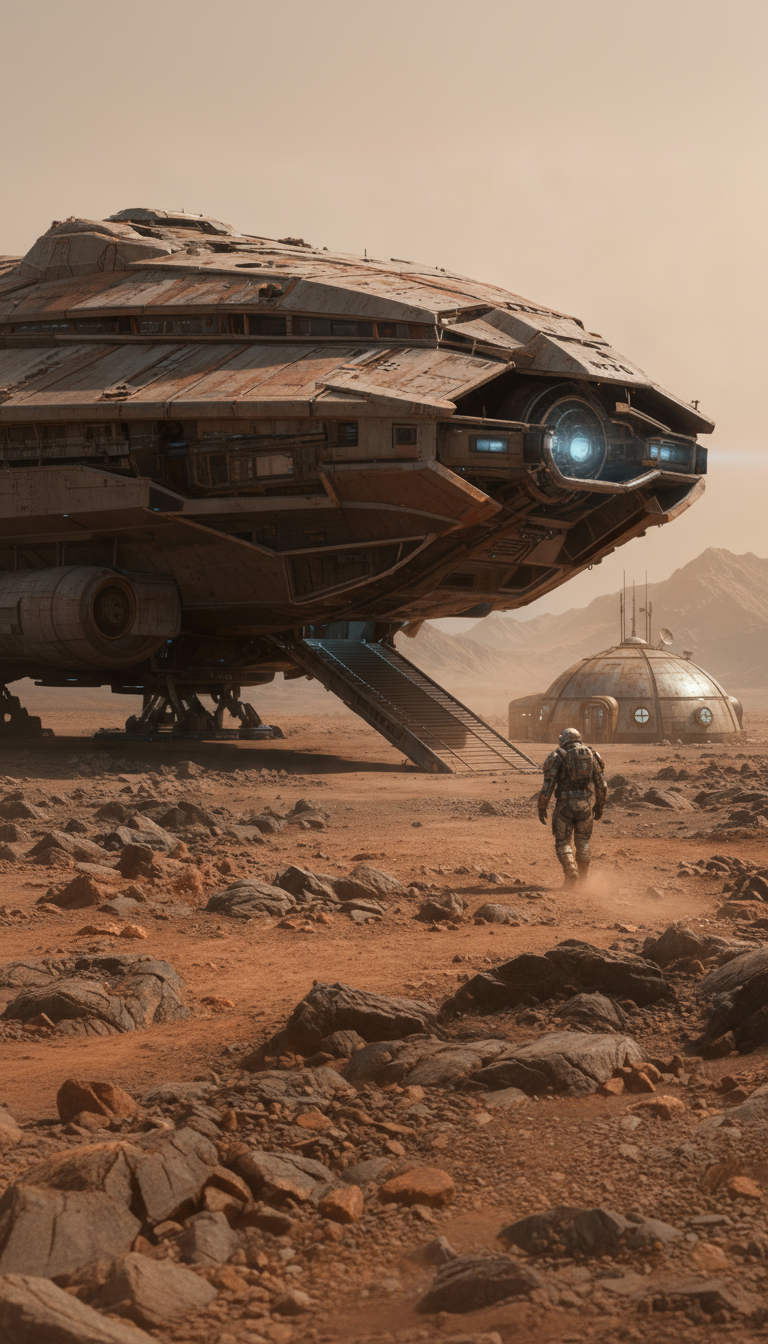 I glance back one final time at Dax and the others, their figures fading into the red horizon. “Ready,” I reply. The Wayfarer rises through the haze, engines rumbling, leaving the outpost and its stories behind for the next set of dreamers and drifters who dare to call Kunlan home.