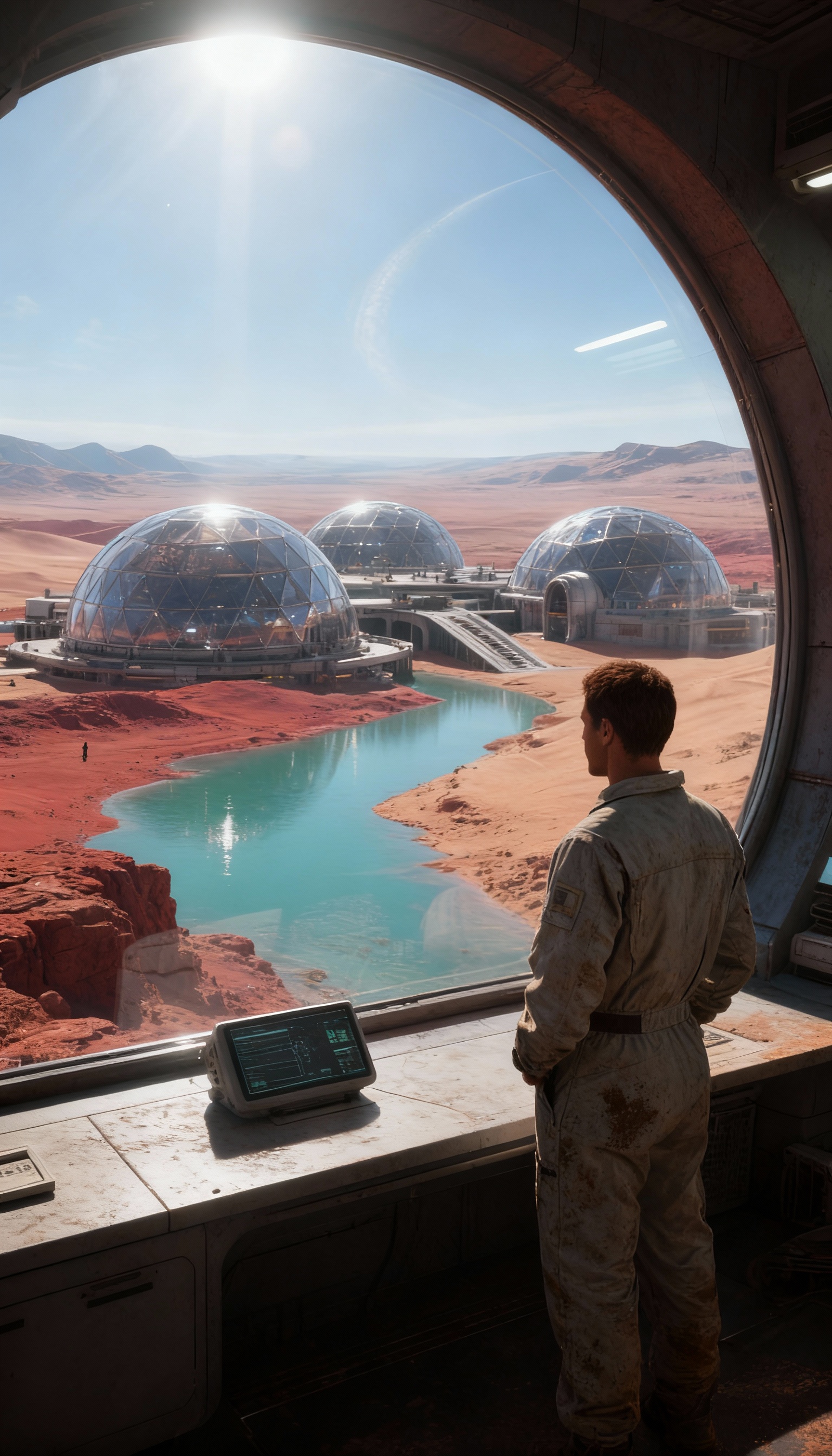 It has been nearly two weeks since I arrived at Red Haven, our shimmering oasis on the edge of the Epsilon Eridani system. The colony domes glitter beneath the pale sunlight, their transparent shells shielding us from the thin, unbreathable atmosphere. Beyond them, the landscape stretches in endless red sand and jagged rock, broken only by the turquoise lake that winds through the valley, our lifeline on this otherwise inhospitable world.